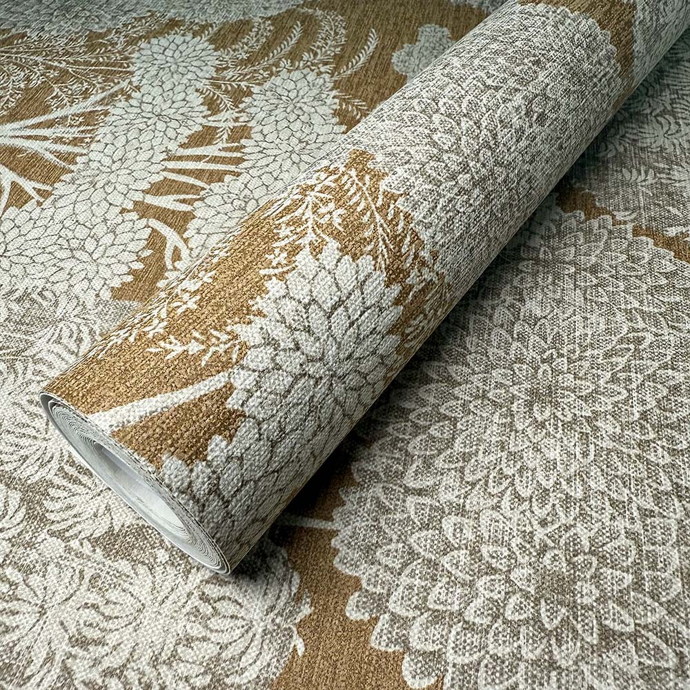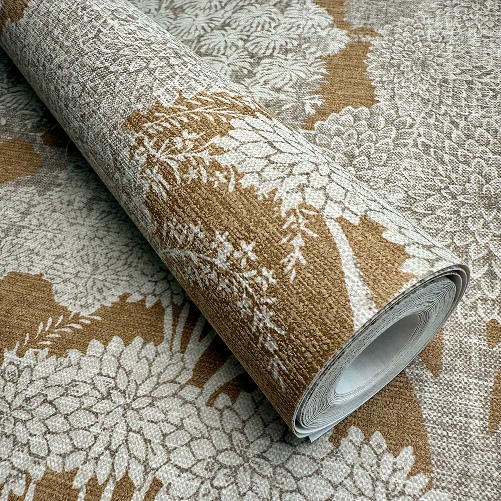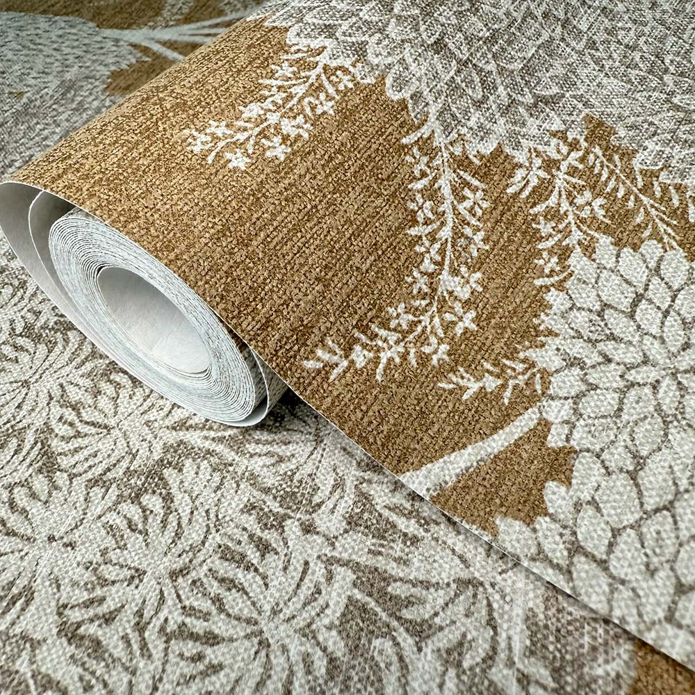 Vallesa Copper features tapestry-style tree motifs, blending rich ochre tones with soft grey accents. Inspired by Spain’s natural beauty and traditional craftsmanship, this wallpaper captures a bold yet refined elegance.
